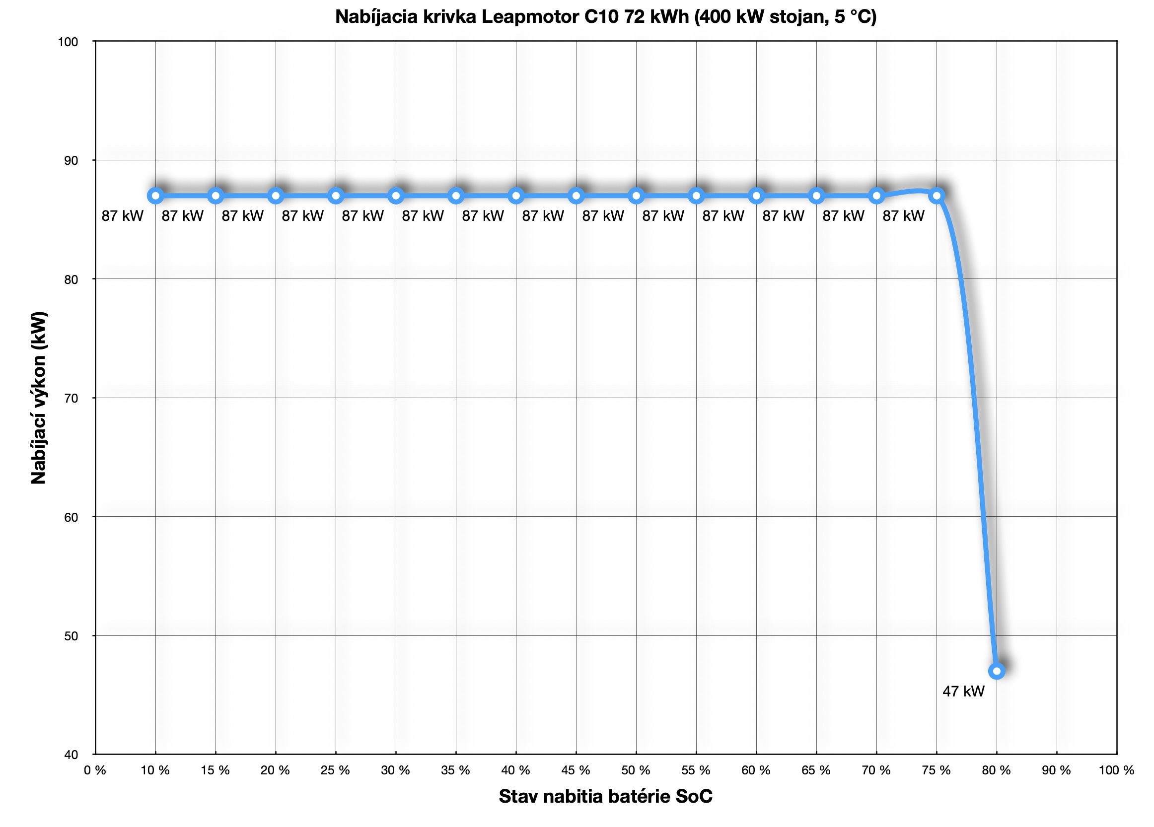 Srdcom energetického systému elektromobilu Leapmotor C10 je batéria s technológiou LFP, ktorá sa teší obľube vďaka svojej mimoriadnej trvanlivosti a bezpečnosti pri prevádzke. Celková kapacita batérie predstavuje 72 kWh, pričom reálne využiteľná hodnota pre potreby jazdy je 69,9 kWh. Sústava sa opiera o klasickú 400-voltovú architektúru, čo je overené riešenie. Oficiálny špičkový výkon nabíjania 84 kW nepôsobí prevratne a výrobca sa v tomto prípade nesústredil na dosiahnutie vysokých hodnôt. V porovnaní s konkurenciou tak nabíjací výkon pôsobí skôr podpriemerne.