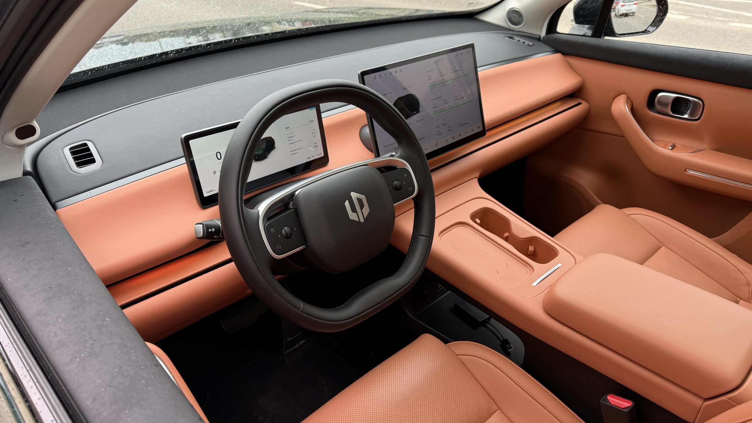 Dominantným prvkom kabíny modelu Leapmotor C10 je hnedé čalúnenie zo syntetickej kože, ktoré priestor opticky zútulňuje a dodáva mu svojskú atmosféru. Celé pracovisko vodiča vsádza na dizajnovú čistotu, pričom palubná doska pôsobí vďaka absencii klasických tlačidiel mimoriadne jednoducho. Hlavným komunikačným kanálom zostáva digitálne rozhranie, cez ktoré prebieha nastavenie väčšiny dôležitých funkcií vozidla. Tento minimalistický prístup je podporený súvislými líniami a hladkými materiálmi, ktoré plynulo prechádzajú do výplní dverí. Dielenské spracovanie jednotlivých dielov v interiéri vykazuje vysokú mieru presnosti, čo prispieva k celkovému pocitu solídnosti a estetickej vyváženosti celého vnútorného usporiadania.